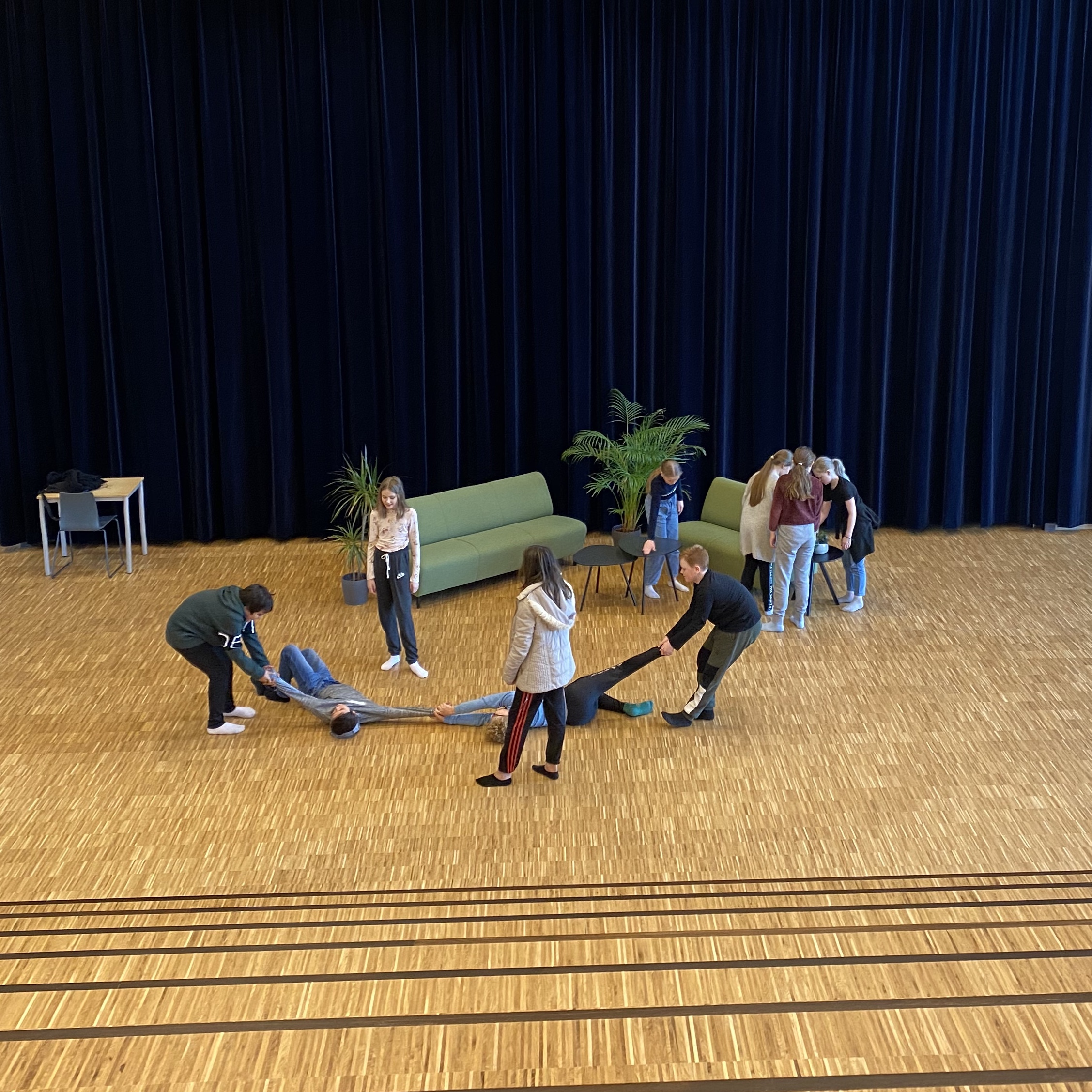 Perfekte forberedelser vil noen si, mens resten av klassen rigga scene og moppa gulv. Vi fikk låne alt vi ville av rektor, og elevene, med de designansvarlige i spissen, bar møbler og planter, planla og pynta, mens noen moppa gulv. De har en helt egen (og utrolig effektiv!) metode på Jæren – og jammen ble det fint!